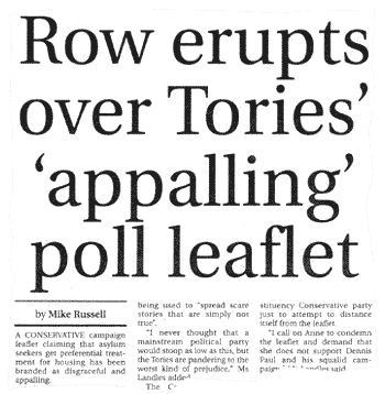 Surrey Advertiser - Row erupts over Tories' 'appalling' poll leaflet (15 April 2005): A Conservative campaign leaflet claiming that asylum seekers get preferential treatment for housing has been branded as disgraceful and appalling.
