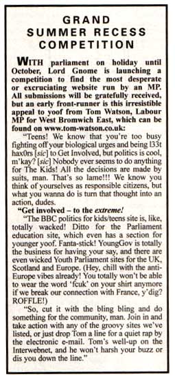 I’m trying to keep mention of Tim Yeo to a minimum on this blog, because now the man has a weblog completely dedicated to him, there’s no point boring you with bits and bobs here day after day.
