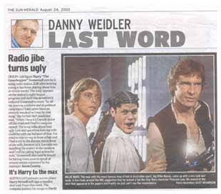 Thanks to Martin, we have a nifty scan of this unexpected tangent to the Star Wars Photoshopping Project from the 24 Aug edition of Sydney’s Sun Herald. The chap featured is Willie Mason. They appear to be making fun of his new hair-do.