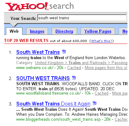 Geoff hasn’t asked for it, but he’s about to get a shedload of help from me on the SEO front. I want people to search for ‘south west trains’ and find his site.