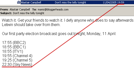 The people over at Bloggerheads got sent a rather brilliant General Election spam e-mail about ‘New’ Labour’s Party Political Broadcast which has been aired tonight purporting to be from “Alistair Campbell”. At least som…