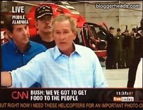 UPDATE – Widely repeated but yet to be confirmed: There was a striking dicrepancy between the CNN International report on the Bush visit to the New Orleans disaster zone yesterday (September 2) and reports of the same event by German TV. ZDF News reported that the president’s visit was a completely staged event. Their crew witnessed how the open air food distribution point Bush visited in front of the cameras was torn down immediately after the president and the herd of ‘news people’ had left and that others which were allegedly being set up were abandoned at the same time. The people in the area were once again left to fend for themselves, said ZDF.