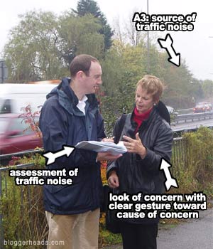 Traffic noise is a hard target that many shy away from, particularly because it is very hard to grimace at the volume, put your fingers in your ears, show a look of concern and gesture toward the source of the noise at the same time. It can be achieved by sharing tasks between two participants (one can grimace at the volume and put their fingers in their ears while the other shows a look of concern and enjoys the free use of both hands to gesture toward the source of the noise and a now-visible sufferer) but here Dennis Paul and Anne Milton have come up with a unique solution.