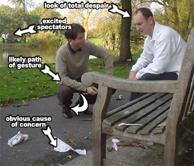 Dennis Paul (in this photo, the primary participant) has crouched down on his haunches. This classic pose allows him to be closer to the cause of concern (which is often found at ground level) and also convey a suggestion of surrounding danger. He has also ingeniously established the campus as his location by posing in front of an eating/drinking area. This is where many students take vital sustenance and discuss the latest pop bands, so there is a strong emotional attachment and they are more likely to recognise it as a landmark. It is also a place that one is likely to find litter, so there is no need to move litter to that location for a full-bodied conveyance of concern.