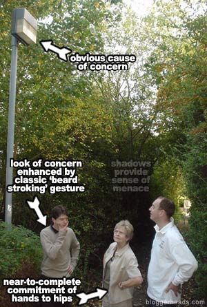 Oh God, that’s so laughable.As a reporter on a daily local paper I’m all too aware of the stunts we have to pull to get a photo to match the “councillors concerned at potholes in road – something must be done, says councillor” type story we’ve just been asked to write… by the councillor (usually a short few weeks from election day, funnily enough.)So we dispatch the poor bugger of a snapper to placate some git with a mission – do the “I’m so concerned… look at me… LOOK AT ME looking CONCERNED… that’s how concerned I am… so now you must know that I’m so concerned about YOU, that you WILL vote for me” – it’s like some piss-poor hypnotic stare even Ming the Merciless wouldn’t be caught dead doing.Bloody laughable. I’ve no doubt the local reporters are pissing themselves with laughter, but keep as straight a face as they can when they confront these two charlies.Wasn’t there a good website – something like “Pete and Geoff blend in” which had these kind of poses?Aha – found itwww.deanandnigel.co.uk