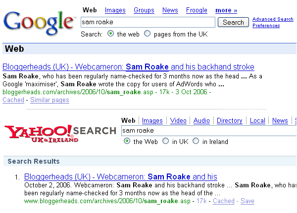 Two bits for the record:1. My server keeps falling over (usually in the middle of the night) thanks to a recent near-constant stream of trackback-spam attacks. If Google comes visiting when this happens, then drops recent individual entries from its database. The individual entry for Sam/Webcameron is the page that’s earned the top search result, so when it’s not in the database, other items rise to the top. (This has happened 3 times in the last 7 days, but it should level out shortly.)2. Oi! I’m a former full-time advertising copywriter! Mind you, this was back in 1999, and I have done a few things besides since then….