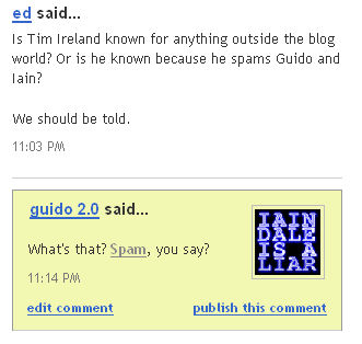 UPDATE – Well said. Thank you.: Paul, I don’t think it is a row about nothing. Iain insulted Tim on 18 Tory Street and then point-blank lied about it when challenged. And there’s been no apology and no withdrawal of the spurious accusation. Tim has an online reputation and Iain has attempted to damage it with an unjustifiable smear. He’s been caught bang to rights but he refuses to even acknowledge it, never mind offer an apology. Instead, he’s doing everything he can to hide the truth of what he’s done from his readers. This ties into the wider point. I’m all for the free flow of information and ideas. It’s another reasons why I started blogging. I’m not all for the right to gratuitously smear/insult/rubbish people who ask awkward questions. The latter, it seems to me, damages the ability of the blo****ere to do the former.
