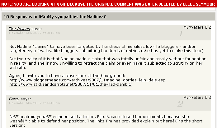Have posted a comment on the strand at Ellee's blog. It has been cleared. It doesn't deal with the issue of the post removal.Nadine Dorries has become British Computer Society-recognised Princess of the Blogs�? Er, not. http://chrispaul-labouroflove.blogspot.com/2007/1…She actually, at a stretch, arguably tied for 13th with George Galloway. Lynne Featherstone was 2nd equal. Which is a lot better. Nads sent out a press release which fails to mention any of the real winners.[mod: link fixed]