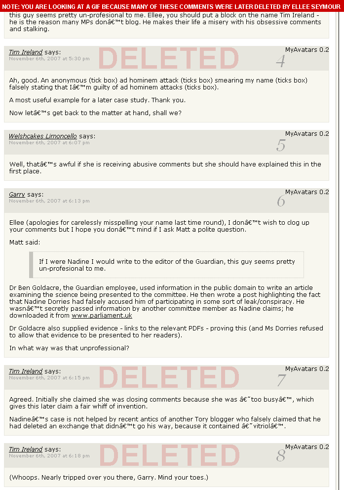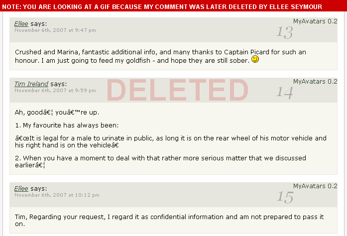 Below are the comments made by Ellee Seymour yesterday in response to repeated questions about her deletion of comments. Now, you have to remember here that Ellee is making these comments knowing that I’ve published a fully documented account of the deletions and the surrounding circumstances here on my weblog, and that the gaps are there for all to see on her own.