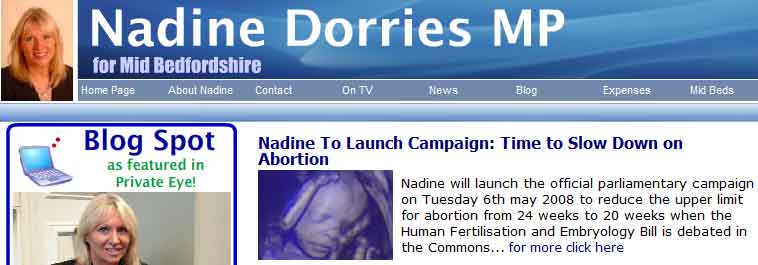 There are so many examples of Nadine breaking these clear-cut rules on her website – particularly in that section she laughingly describes as a ‘blog’ – that it’s hard to know where to start (or end) but I think a good example is her recent targeting of four Labour MPs over the abortion issue, as it ticks all the boxes; it’s personal in nature (though most of the purely personal entries on her blog are more vindictive than this) , it’s party-political (look at who she targets), and it’s done in support of a cause.