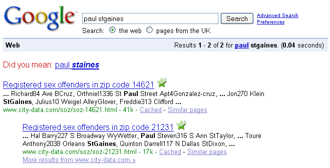 I just popped into Google on my way to scan Paul Staines’ Wikipedia entry (it’s often educational* to watch who is changing, vandalising or fixing it, just in case you’re wondering) but made a bit of a typo.