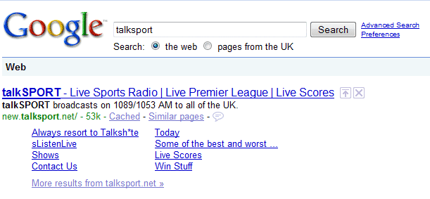 Amusing (unintended) Googlebomb here:http://www.google.co.uk/search?hl=en&q=talksportUnder talksport you get "Always resort to Talksh*te"This link goes to 'listen now'. Why?One post on the "Friends of Fulham" forum:http://www.websitetoolbox.com/tool/post/friendsof…Very easy….