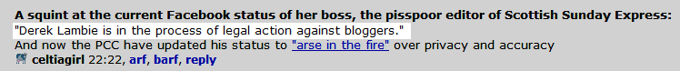 I’m hearing noise about pending/current legal action from the corner of Derek Lambie, editor of the Scottish Sunday Express.