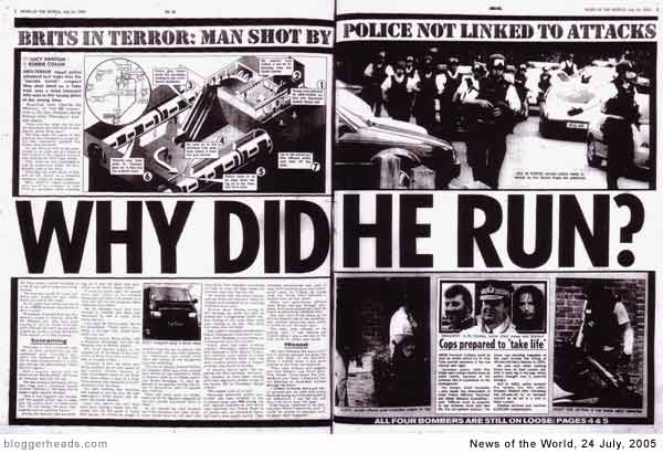 – The article states as fact that Jean Charles de Menezes was wearing “a bulky winter coat despite the warm weather” (i.e. something conspicuous that might have hidden a bomb belt). He wasn’t.