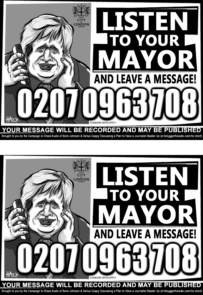 Londoners are encouraged to print and display the poster below and/or call (0207) 0963708 to listen to their mayor. They can even leave a message if they like. Selected messages will be published at the brand new blog at http://boris-johnson.blogspot.com/