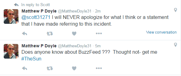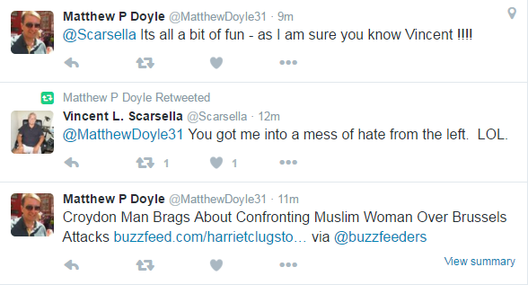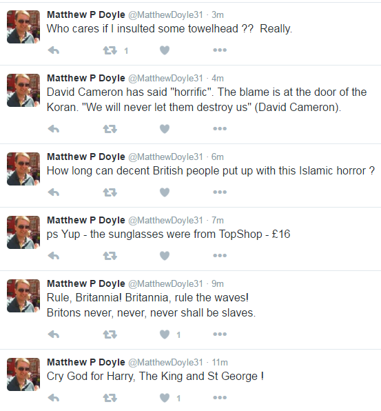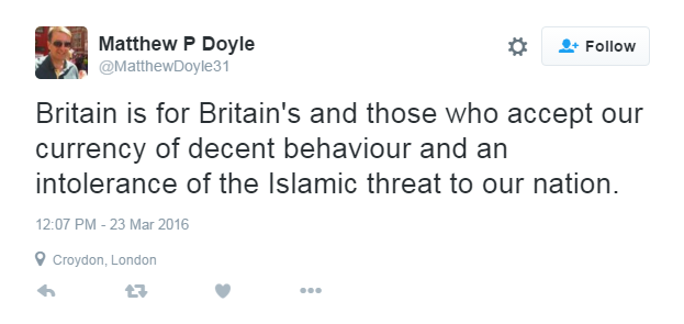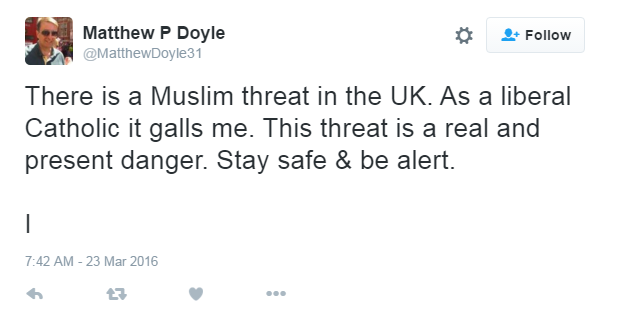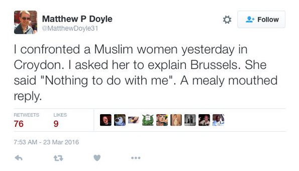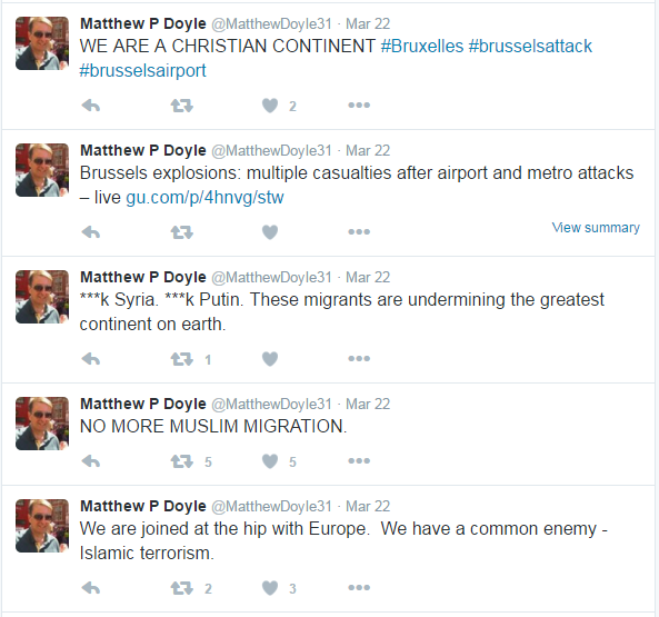 Judging by that statement, it was probably not a real or imagined confrontation in the street that got Mr Doyle into trouble, but more likely the bravado that he showed in the face of criticism, and even some messages preceding his ‘confrontation’ claim. Taking a look back at earlier tweets, in the immediate wake of the Brussels event, he was tweeting all-caps messages like “WE ARE A CHRISTIAN CONTINENT” and “NO MORE MUSLIM MIGRATION” and blaming atrocities in whole or in part on Syrian refugees: