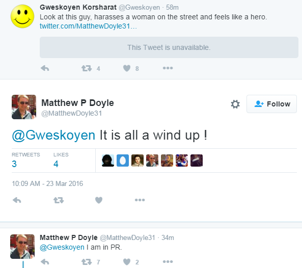 In the face of this, the tweet was deleted, and Matthew P Doyle proceeded to pass the comment off as a “wind up”, heavily implying through various tweets and retweets that he was satirising prejudice, not displaying/furthering it. Here is one such example: