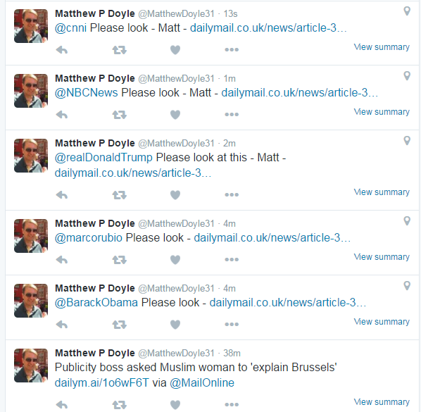UPDATE (24 March) – *sigh*… Mr Doyle had a very busy day yesterday, and his attention-seeking behaviour included tweeting links to a Daily Mail article about him to various news outlets, and people like Donald Trump and Barack Obama: