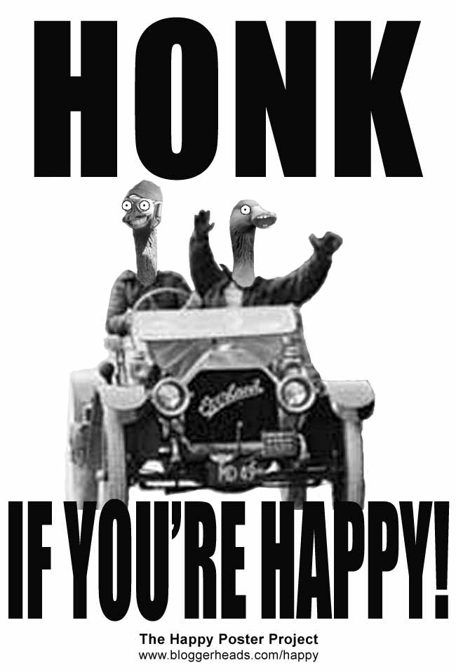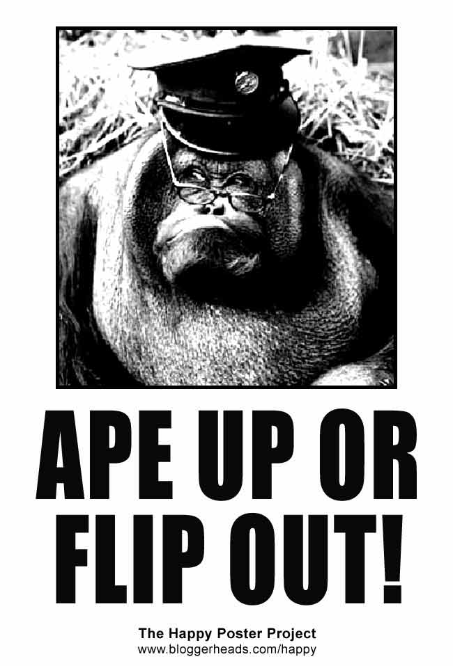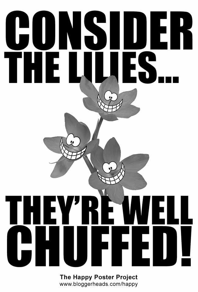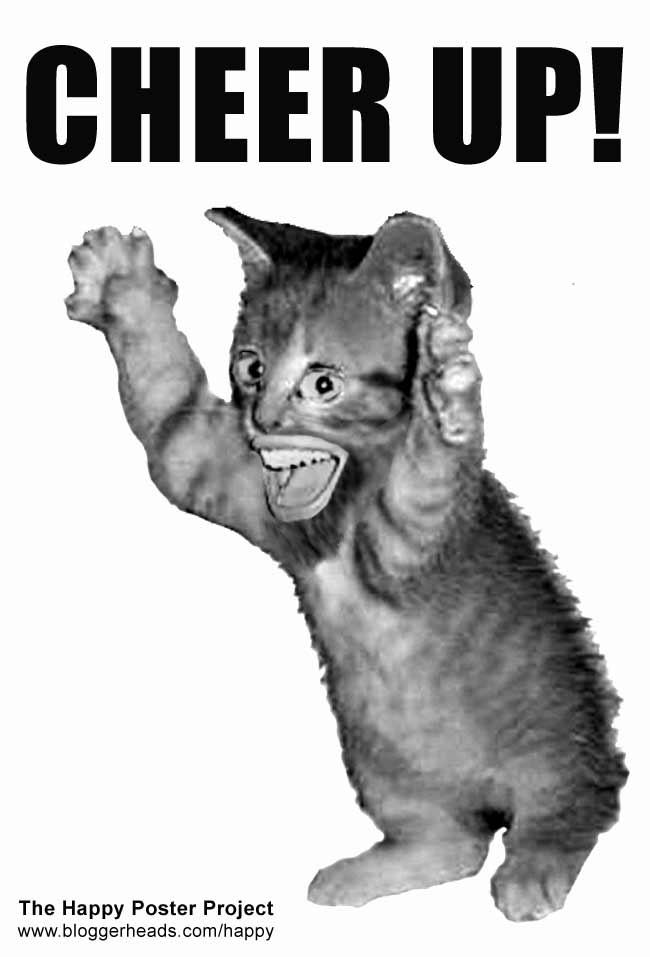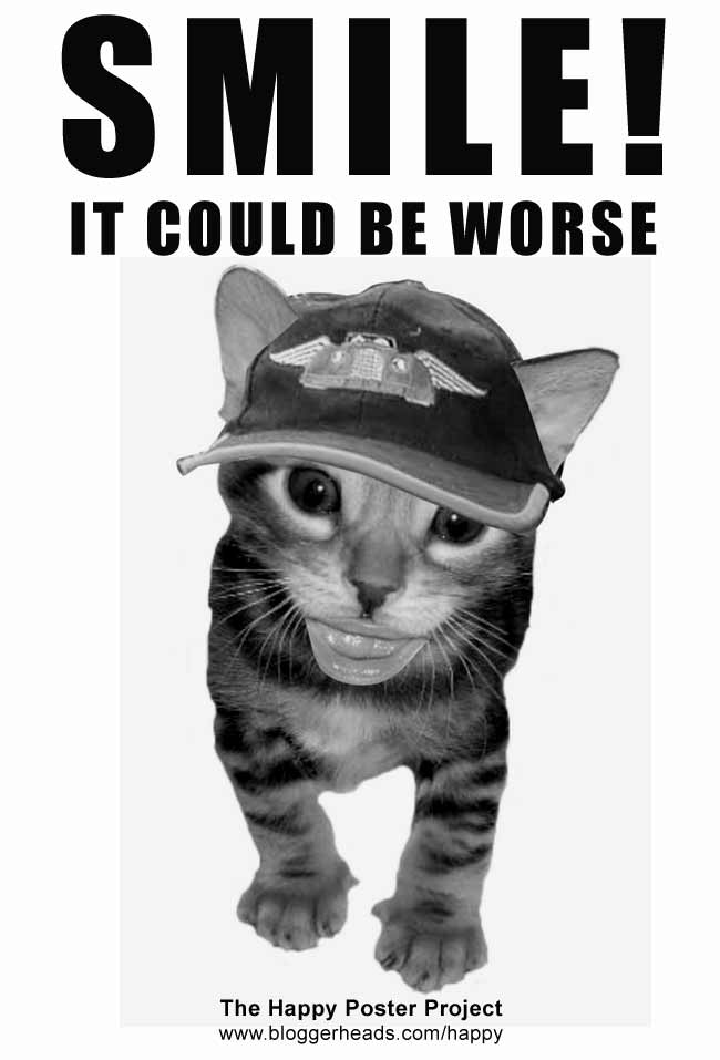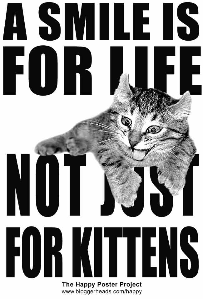 METHOD: Download your favourite poster(s) from the selection below. Print/photocopy as many copies as you think you'll need. Put one up at work or home. Then walk down your local High/Main St asking shop owners and managers if you can put a happy poster in their window. You'll feel a bit silly at first; that's to be expected. If anybody asks you why you want to put a poster up, or what the poster is for, tell them: "I want to make people happy!" Try not too look to crazed when you do this. If you come across any sourpusses along the way, send us the details and we'll do our best to publicly shame them. LINKS: Of course you can link to us from your website. But if you do so without putting up at least one poster yourself, then the screaming meanies will come and get you. While you sleep. Then you'll get all scared and wet the bed, and that won't make you very happy, now will it? PICTURES OF POSTERS: We'd love to hear your stories and see pictures of posters you've put up. Especially if you've been chased or unfairly associated with a religious group. Send them here. IMAGES FOR POSTERS: We're happy to format the posters for download, all we need from you is deliriously happy images. That you've made. (No unhappy pictures, large files, images that you don't have permission to use, or images that aren't your own cleverly 'shopped work please, or you will wake up cold, wet and ashamed.) You can host the finished product(s) yourself, or we can host it and give you a credit link. Remember, there's no need to fiddle about making a finished poster. We're anal enough to want to do that ourselves. Send your happy images here. Click on any image to see a print-worthy version in a new window. |