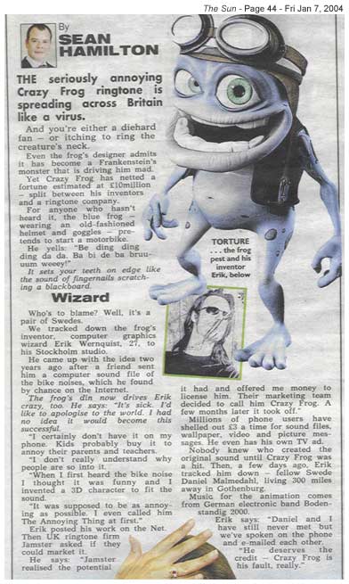 The reason for this guess is this Jan 7 article from The Sun by Sean Hamilton about… the origins of the Crazy Frog ringtone.