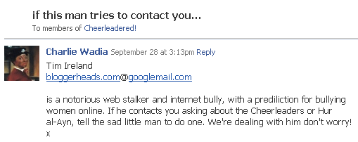 The ‘Cheerleaders’ have now published extracts of this correspondence on their Facebook page, accusing me of cowardice (because everybody settles ill-defined differences with fist-fights, don’tcha know).