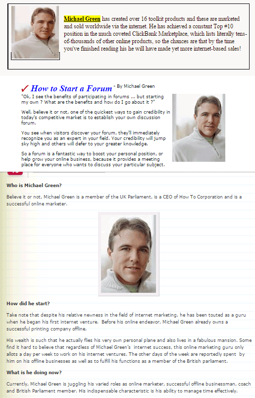 (Interesting fact: The fee for a one-hour telephone consultation with ‘Michael Green’ of michaelgreenconsulting.com was a mere US$297 . Also, this was one of many sites where ‘Michael Green’ billed himself as “the owner of the World’s Largest Internet Marketing Forum”.)